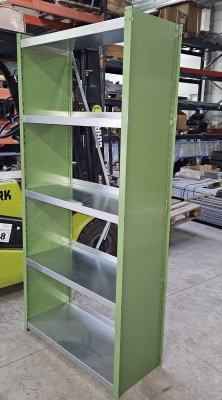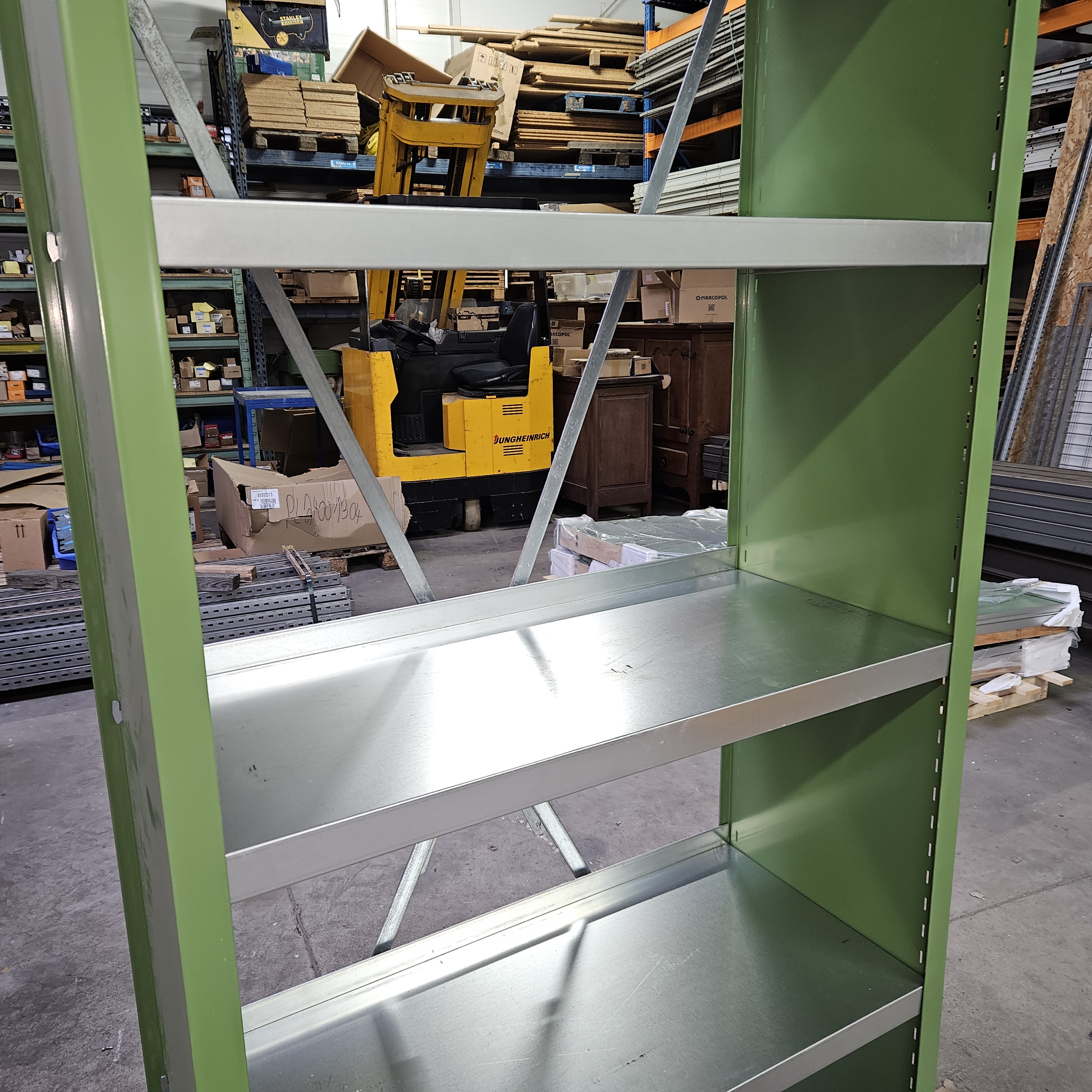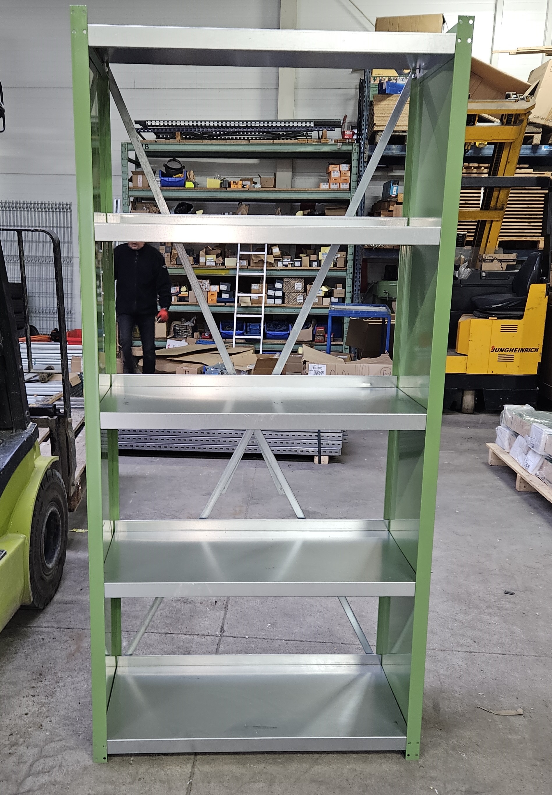 Regał metalowy półkowy z 5 poziomami. Doskonałe rozwiązanie do przechowywania ciężkich towarów o maksymalnym rozkładzie ładunku 150 kg na półkę.Regał półkowy, nowyProducent: VOGELSANG ( NIEMCY )( 5 półek x 150 KG) zestawCENA NETTO: 530,- PLNParametry:Wysokość: 2000 mmGłębokość : 400 mmDługość półki: 900 mmIlość poziomów: 5Regulacja poziomów: co 50 mmIlość modułów: 1Ilość półek w zestawie: 5Skład zestawu: 2 ramy kompletne 2,0 m, 5...